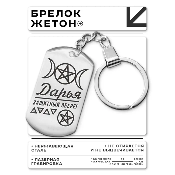 Размеры и комплектация: Размер жетона 50х28 мм, в комплекте кольцо для ключей.