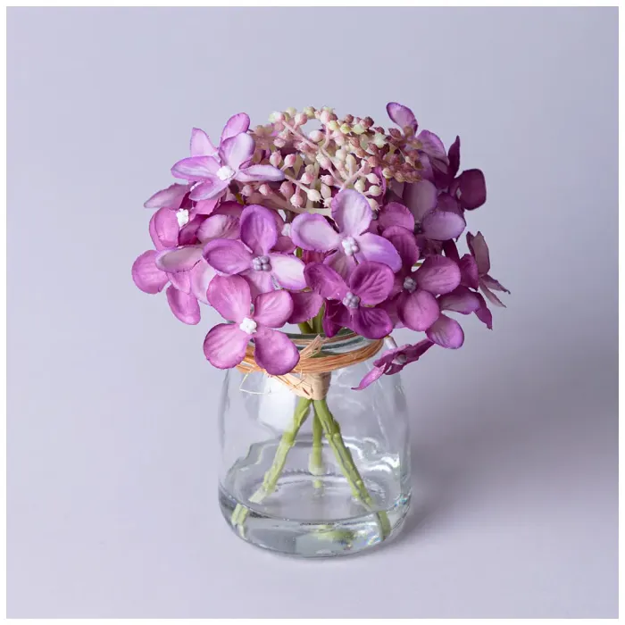 Цветы выполнены из качественной ткани и полиэтилена, что придаёт им естественный вид. Ваза изготовлена из стекла и наполнена искусственной водой, создавая иллюзию свежесрезанных растений. Такой букет не требует полива, пересадки или особого освещения, поэтому его можно разместить даже в тёмных уголках дома.