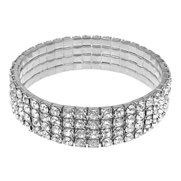 Стрейч-браслет из бижутерного сплава с покрытием под серебро, украшенный стразами. Ширина 1,5 см.