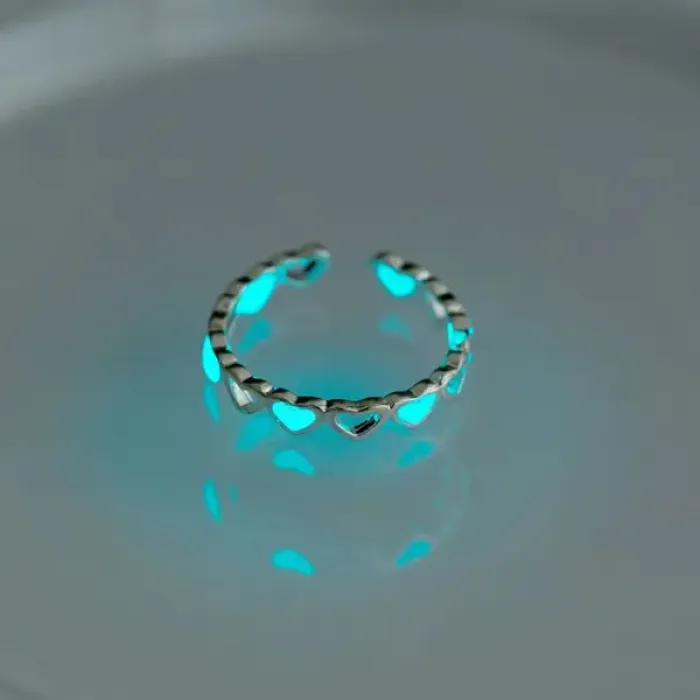 Безразмерное кольцо-сувенир из бижутерного сплава со светящимся в темноте элементом в форме сердца бирюзового цвета.