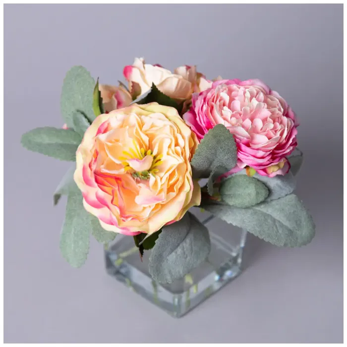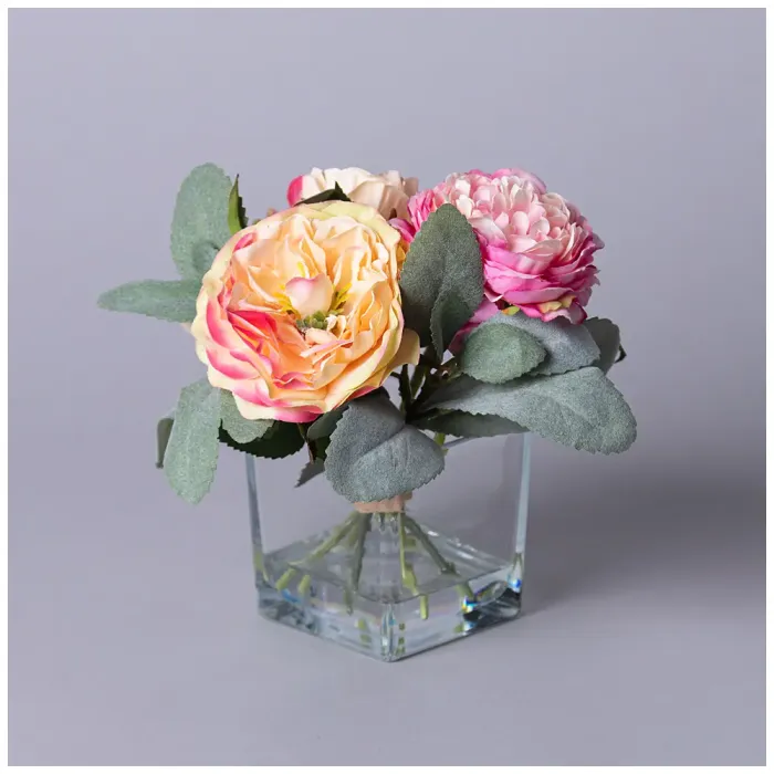Букет искусственных цветов в квадратной вазе от Lefard предназначен для украшения интерьера. Он подходит для любого помещения, добавляя яркости и уюта. Искусственные цветы не требуют ухода, характерного для живых растений.