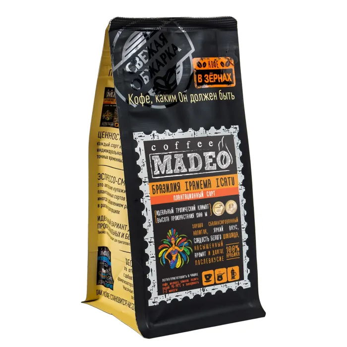 Набор включает два вида кофе Madeo: плантационный «Бразилия Ipanema Icatu» и ароматизированный «Ирландский крем». Оба представляют собой 100% арабику. Вкусовой профиль набора варьируется от интенсивной шоколадной ноты и горчинки до мягких сливочных и ореховых акцентов.