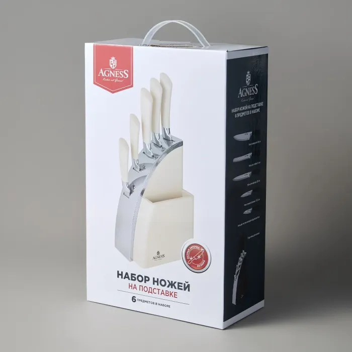 Для сохранения остроты лезвий предпочтительна ручная мойка. Набор можно комбинировать с другими кухонными аксессуарами бренда Agness.