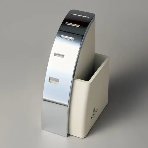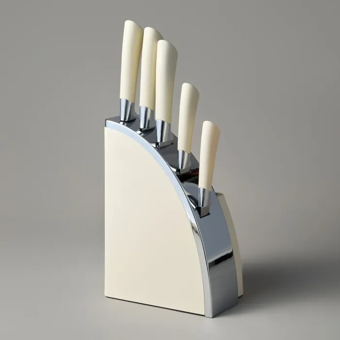 Лезвия изготовлены из коррозионностойкой нержавеющей стали с двухсторонней заточкой. Эргономичные ручки из пластика предназначены для комфортного захвата. Пластиковая подставка служит для безопасного и компактного хранения всех предметов набора.