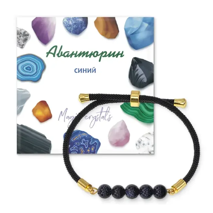 Регулируемый браслет с бусинами из синтетического авантюрина синего цвета на черном шнуре.