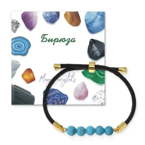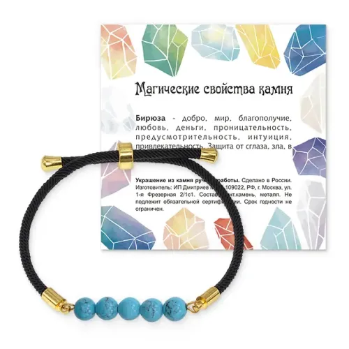 Браслет с бусинами из синтетического камня бирюза на регулируемом черном шнуре.