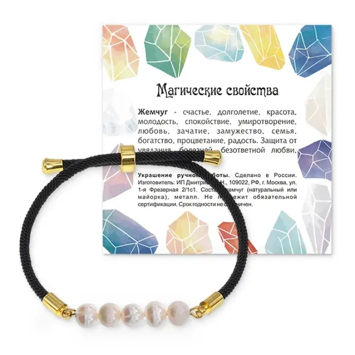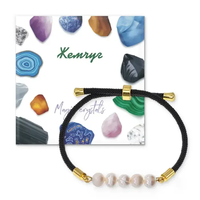 Браслет с бусинами из натурального речного жемчуга на черном шнуре. Регулируемый по обхвату запястья.