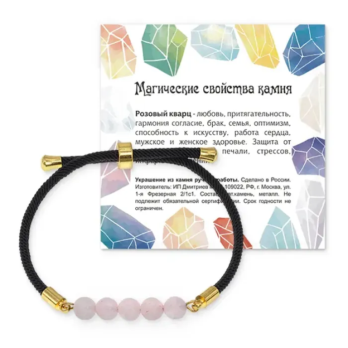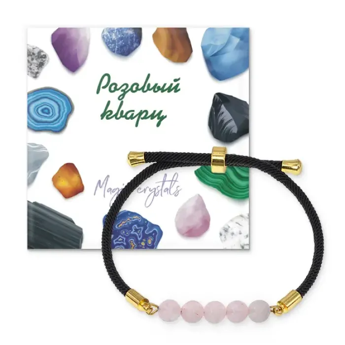 Браслет с бусинами из натурального розового кварца на черном шнуре с регулируемой застежкой.