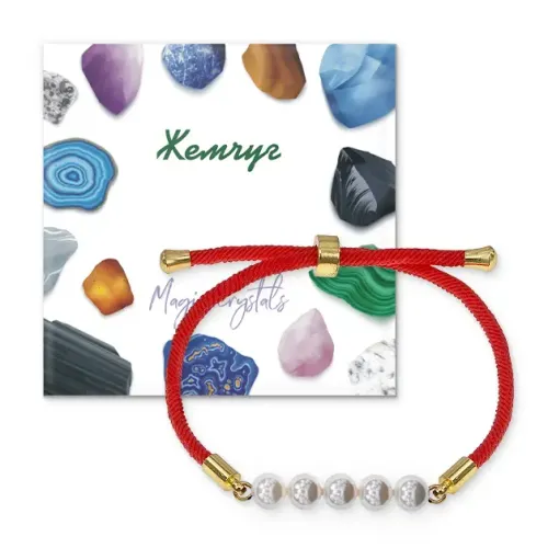Браслет с бусинами из искусственного жемчуга (майорки) на красном шнуре.