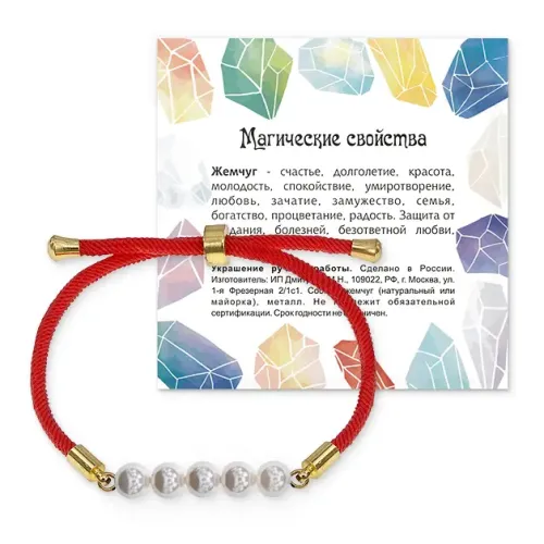 Размеры и комплектация: Диаметр бусин 6 мм, диаметр шнура 3 мм. Максимальный внутренний диаметр браслета — 7 см. Упаковка — прозрачный полипропиленовый пакет с подвесом. В комплекте вкладыш с описанием.