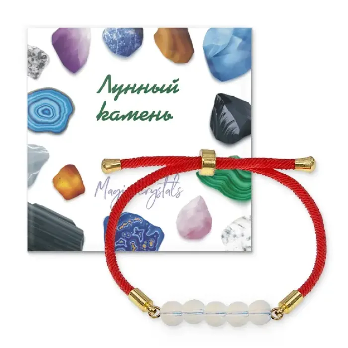 Браслет с бусинами из синтетического лунного камня на регулируемом красном шнуре.