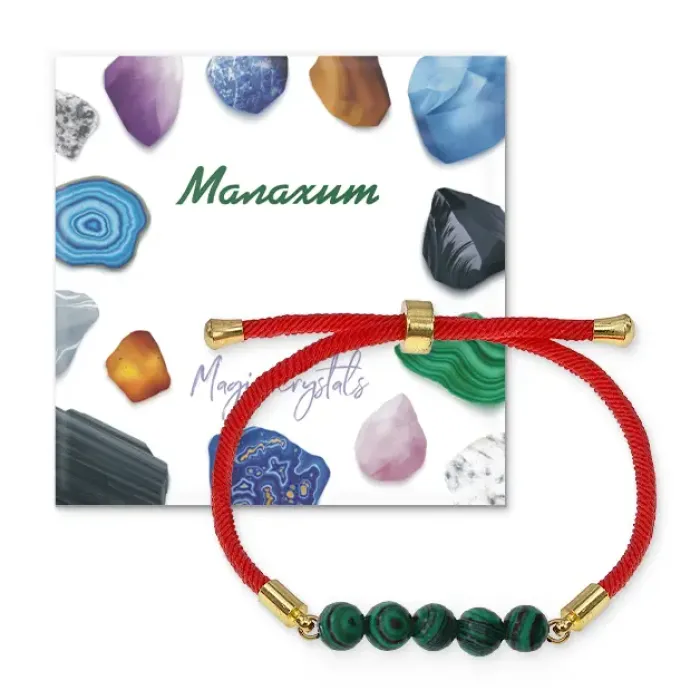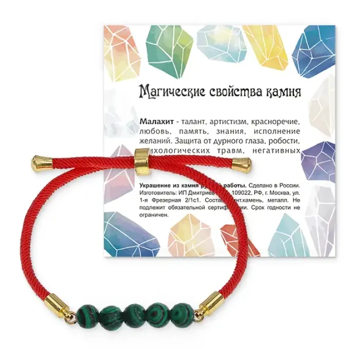 Браслет с бусинами из синтетического малахита на регулируемом красном шнуре.