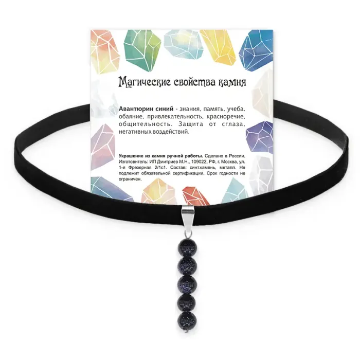 Элегантный бархатный чокер с подвеской из синтетического камня авантюрина синего цвета — стильное украшение, которое добавит изысканности любому образу. Этот аксессуар регулируется по размеру, что обеспечивает комфортную посадку. Ширина чокера составляет 6 мм, длина — 30 см с дополнительной цепочкой в 5 см, а внутренний диаметр варьируется от 9,5 до 11 см. Упакован в прозрачный пакет и комплектуется вкладышем с описанием значений камня, который традиционно ценится за свои свойства привлекать удачу и гармонию. Материал изделия — искусственный бархат, что делает его приятным на ощупь и легким в носке.