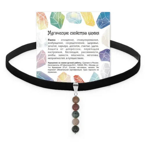 Каждый чокер упакован в прозрачный пакет и включает вкладыш с описанием значений яшмы, что делает его отличным подарком для близких или приятным дополнением к собственному стилю. Изготовлен из искусственного бархата, он сочетает в себе мягкость и стильный внешний вид.