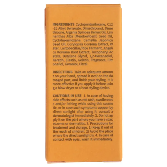 Состав: Cyclopentasiloxane, C12-15 Alkyl Benzoate, Dimethiconol, Dimethicone, Fragrance, Argania Spinosa Kernel Oil (аргановое масло), Camellia Japonica Seed Oil (масло семян камелии), Limnanthes Alba (Meadowfoam) Seed Oil (масло пенника лугового), Tocopheryl Acetate (витамин E), Angelica Koreana Root Extract (экстракт корня ангелики корейской), Lactobacillus/Rice Ferment (ферментированный рисовый экстракт).