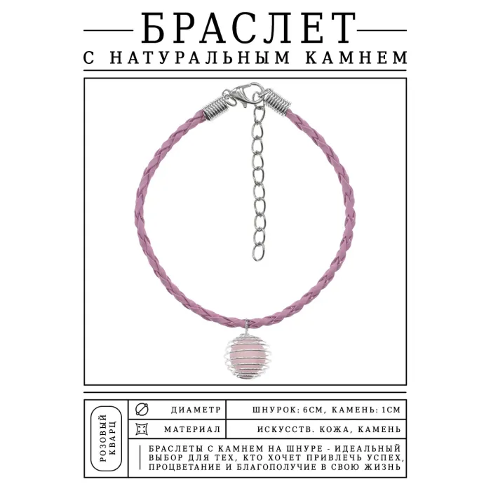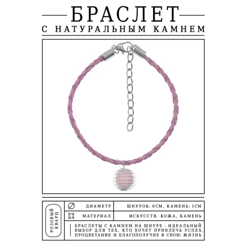 Браслет с натуральным камнем розовый кварц на регулируемом шнурке.