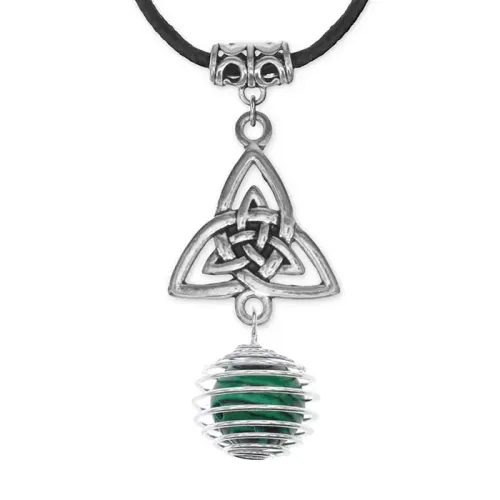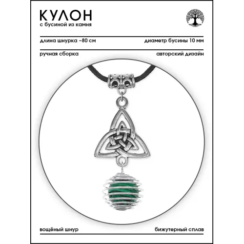 Амулет-кулон Трикветр из бижутерного сплава с синтетическим камнем малахит и покрытием под серебро.