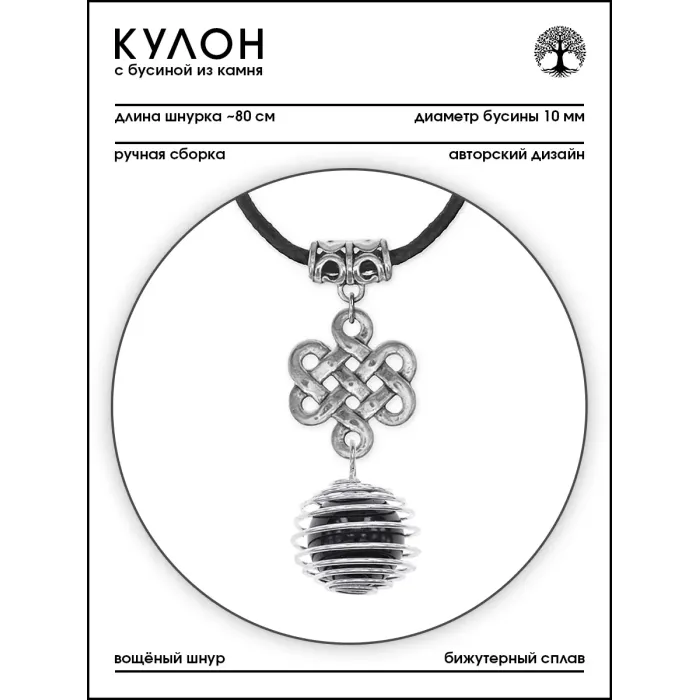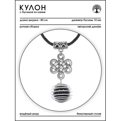Размеры и комплектация: Диаметр каменной бусины — 10 мм. В комплекте вощёный шнурок длиной около 80 см. Упаковка — прозрачный пакет.