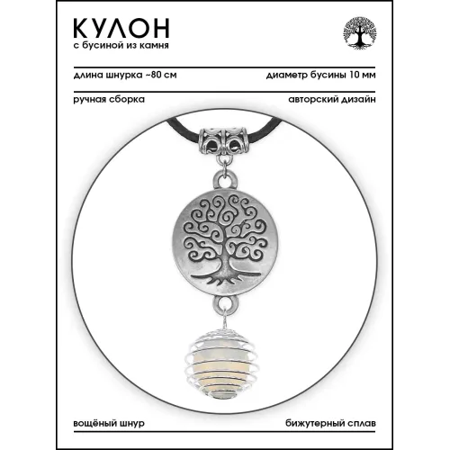Размеры и комплектация: Диаметр бусины 10 мм. Комплектуется вощёным шнурком длиной около 80 см. Упаковка — прозрачный пакет.