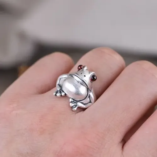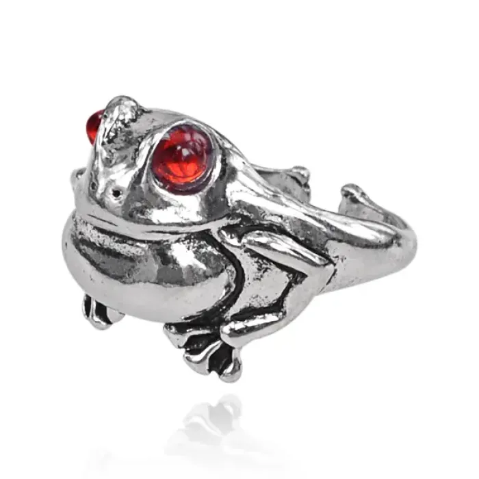 Безразмерное кольцо в виде лягушки из бижутерного сплава со стеклянными вставками.