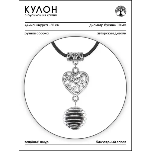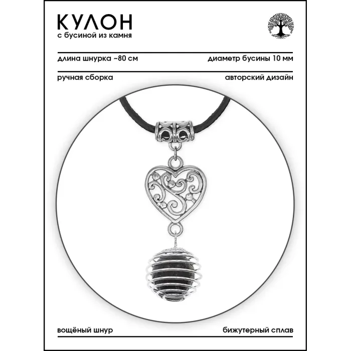 Размеры и комплектация: Диаметр бусины 10 мм. Комплектуется вощёным шнурком длиной около 80 см. Упаковка — прозрачный пакет.