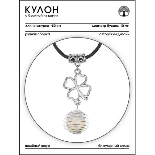 Размеры и комплектация: Диаметр бусины 10 мм. Комплектуется вощёным шнурком длиной около 80 см. Упаковка — прозрачный пакет.