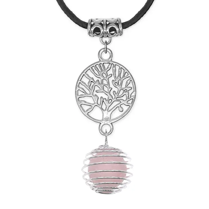 Кулон-амулет ручной работы из натурального розового кварца в металлической оправе с символом «Дерево жизни».