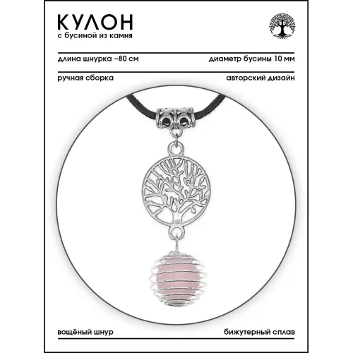 Размеры и комплектация: Диаметр бусины из розового кварца — 10 мм. Комплектуется вощёным шнурком длиной около 80 см. Упаковка — прозрачный пакет.