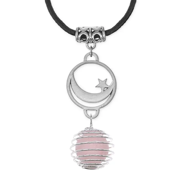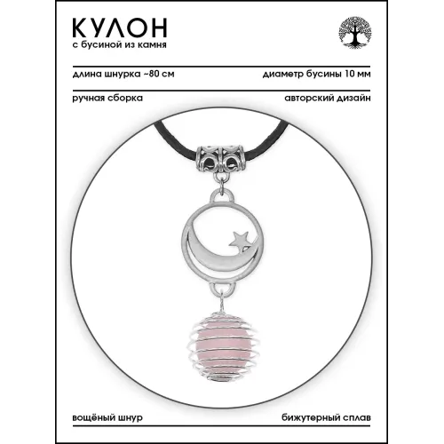 Кулон-амулет ручной работы из натурального розового кварца в форме полумесяца со звездой.