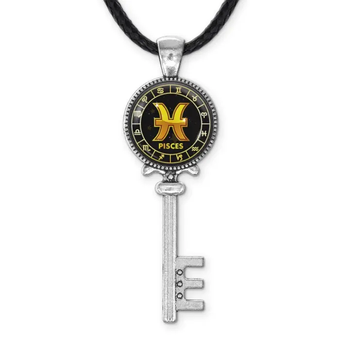 Кулон-амулет в виде ключа со знаком зодиака Рыбы, выполненный из бижутерного сплава с серебристым покрытием. Изображение защищено выпуклой стеклянной линзой.