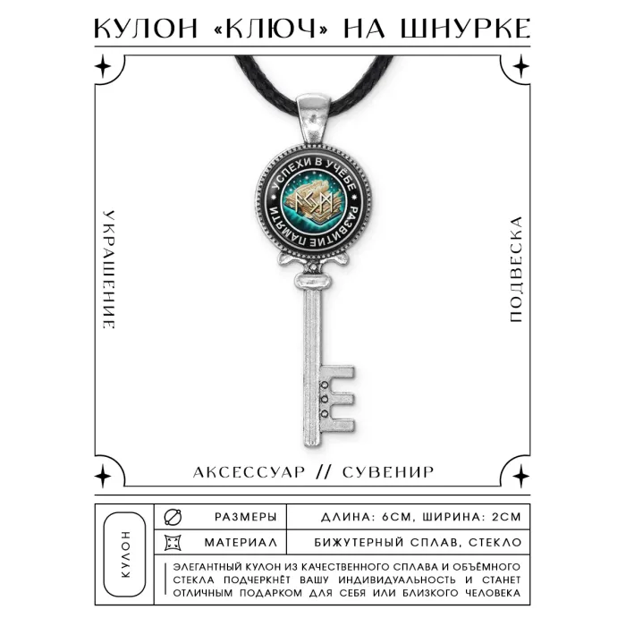 Кулон «Ключ Успехи в учёбе и развитие памяти» из бижутерного сплава с изображением под выпуклой стеклянной линзой.