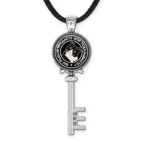 Сувенирный кулон в виде ключа из бижутерного сплава с покрытием под серебро и защитным стеклянным элементом.