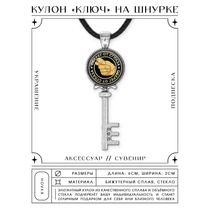 Кулон Ключ — это стильный амулет, выполненный из бижутерного сплава с покрытием под серебро. Символизируя защиту от сглаза, он станет не только модным аксессуаром, но и оберегом для своего владельца. В комплект входит удобный шнурок с застёжкой, что позволяет носить кулон на шее без лишних хлопот.