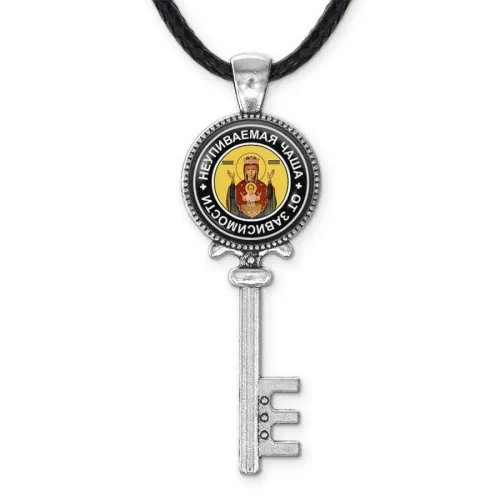 Кулон-ключ с изображением Пресвятой Богородицы (Неупиваемая Чаша). Изготовлен из бижутерного сплава с покрытием под серебро, изображение защищено выпуклой стеклянной линзой.