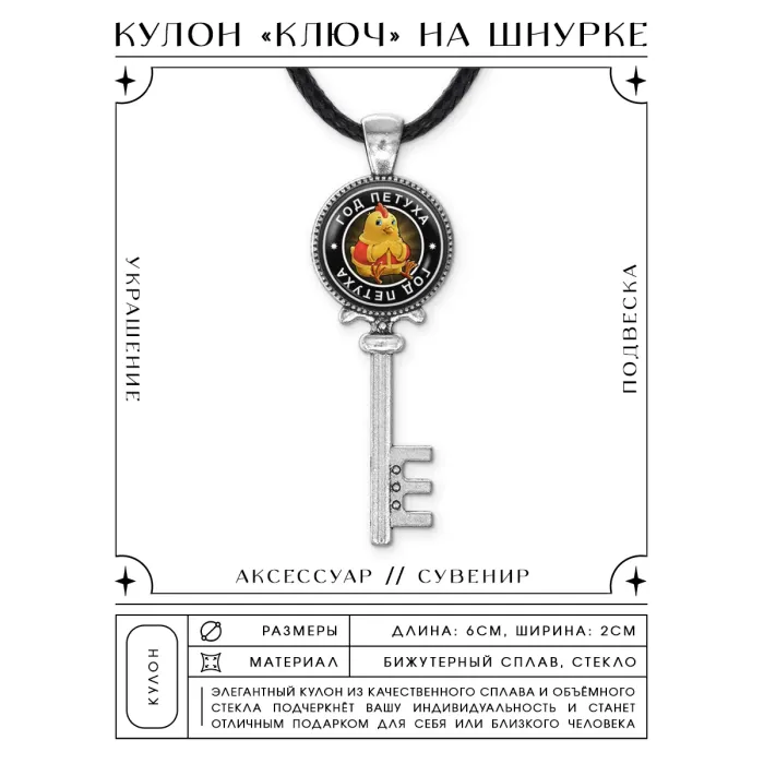 Кулон-ключ с символикой года Петуха по восточному гороскопу. Изготовлен из бижутерного сплава с покрытием под серебро, изображение защищено выпуклой стеклянной линзой.
