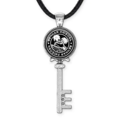 Кулон-ключ из бижутерного сплава с покрытием под серебро и изображением под выпуклой стеклянной линзой.