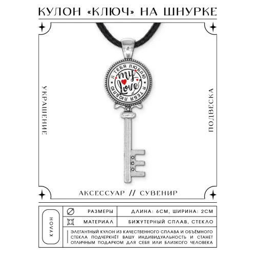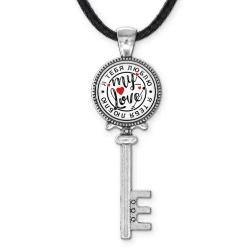 Кулон в виде ключа с надписью «Я тебя люблю». Изготовлен из бижутерного сплава с покрытием под серебро.