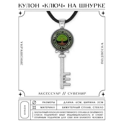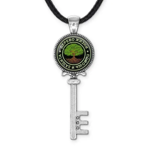 Кулон-ключ из бижутерного сплава с изображением Дерева жизни под выпуклой стеклянной линзой.