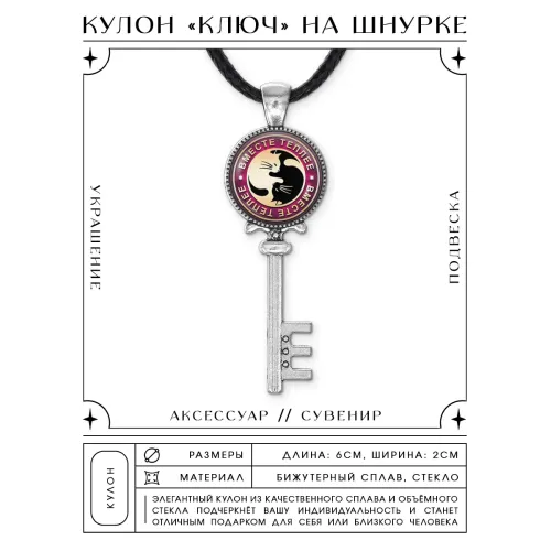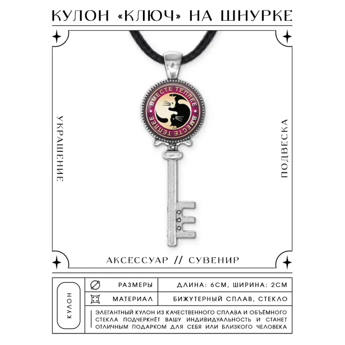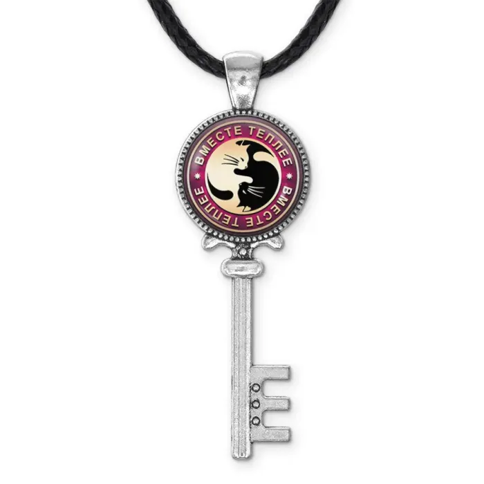 Сувенирный кулон в виде ключа из бижутерного сплава с покрытием под серебро и выпуклым стеклянным элементом.