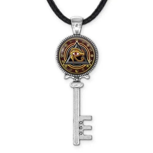 Кулон-амулет из бижутерного сплава с изображением Ока Ра под выпуклой стеклянной линзой.