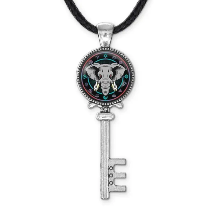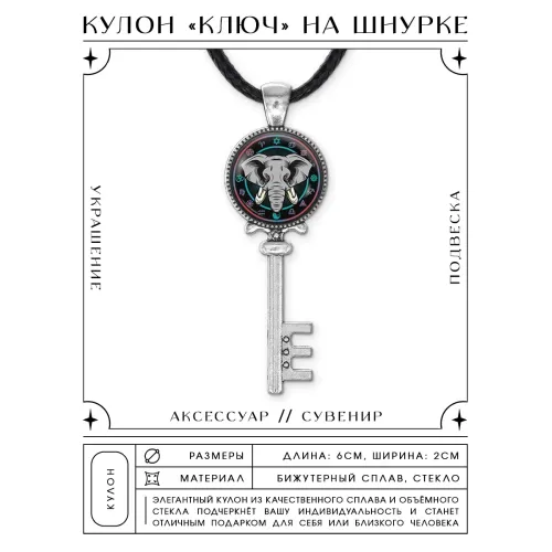 Кулон-ключ в виде слона из бижутерного сплава с выпуклым стеклянным элементом.