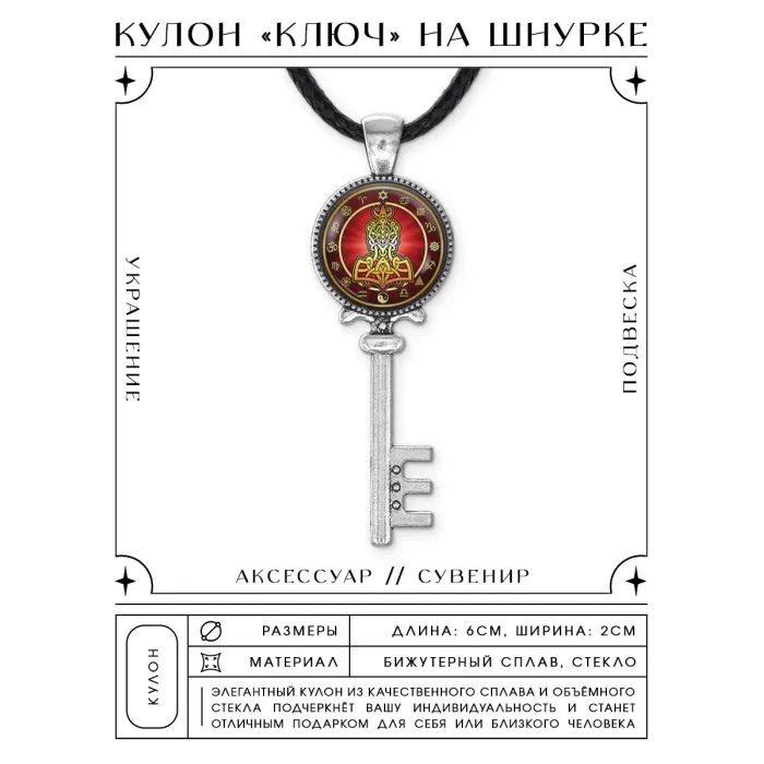 Кулон-амулет в виде ключа и молота Тора из бижутерного сплава с покрытием под серебро и стеклянной линзой.