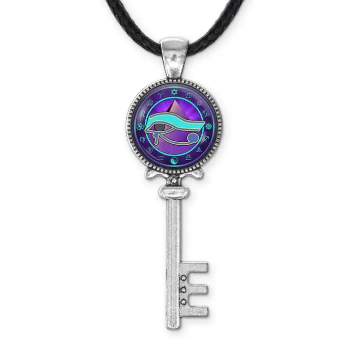 Сувенирный кулон в виде ключа с символом Глаз Гора из бижутерного сплава с серебристым покрытием и стеклянной линзой.
