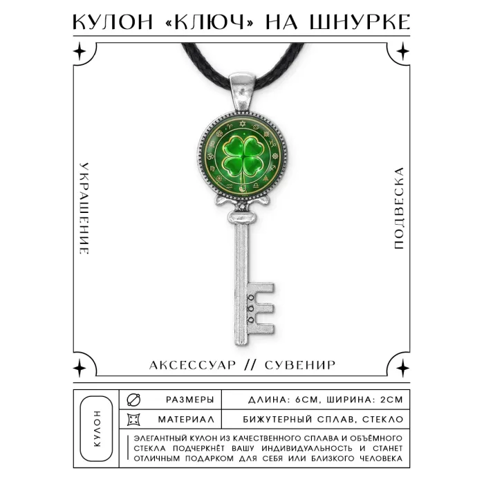 Кулон «Ключ Клевер удачи» из бижутерного сплава с изображением под выпуклой стеклянной линзой.