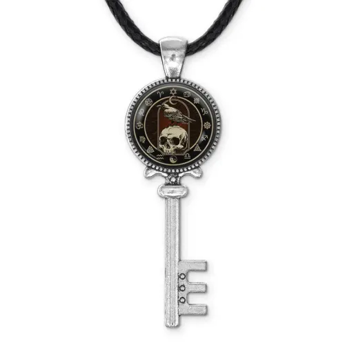 Кулон-амулет из бижутерного сплава с изображением ключа и ворона на черепе.
