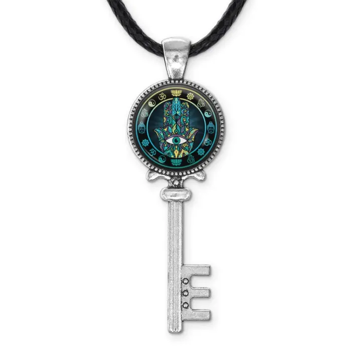 Кулон-амулет из бижутерного сплава с изображением Хамсы под выпуклой стеклянной линзой.