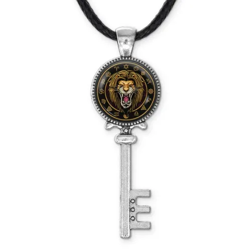 Кулон-ключ с изображением льва из бижутерного сплава с покрытием под серебро. Изображение защищено выпуклой стеклянной линзой.