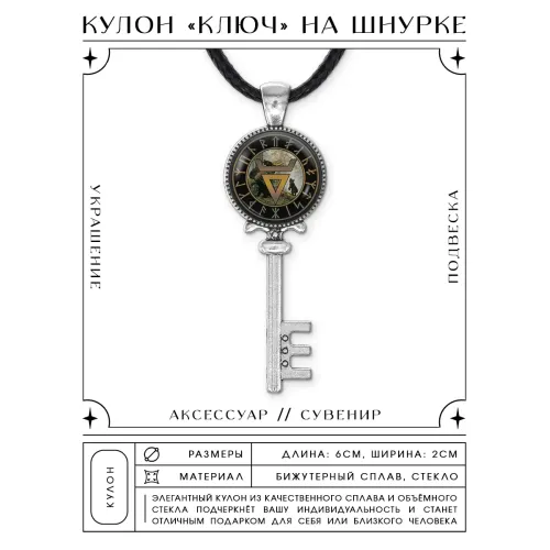 Сувенирный кулон в виде ключа с изображением Велеса. Изготовлен из бижутерного сплава с покрытием под серебро, изображение защищено выпуклой стеклянной линзой.