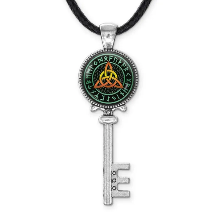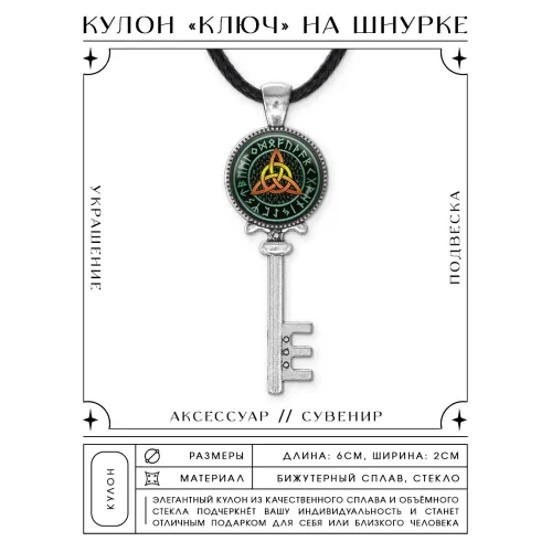 Кулон-ключ из бижутерного сплава с изображением трикветра под стеклянной линзой.
