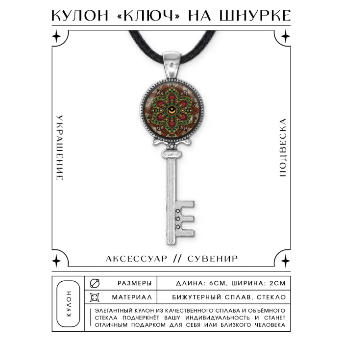 Кулон-ключ из бижутерного сплава с изображением мандалы, звезды и полумесяца под стеклянной линзой.